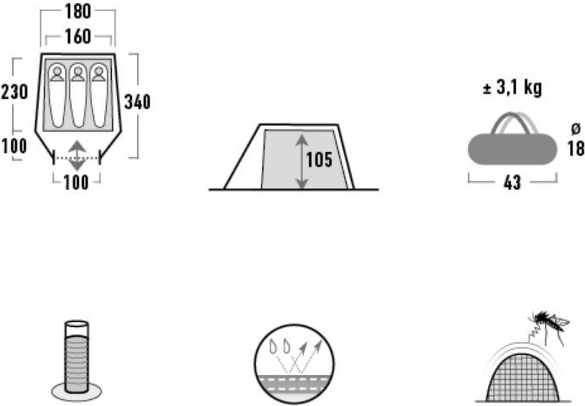 High Peak Lichtgewicht Tunneltent Kite 3 LW, Trekking Tent 3 Personen, 3,1 Kg, Aluminium Stokken, 3000 Mm Waterdicht, Extra Lang 230 Cm