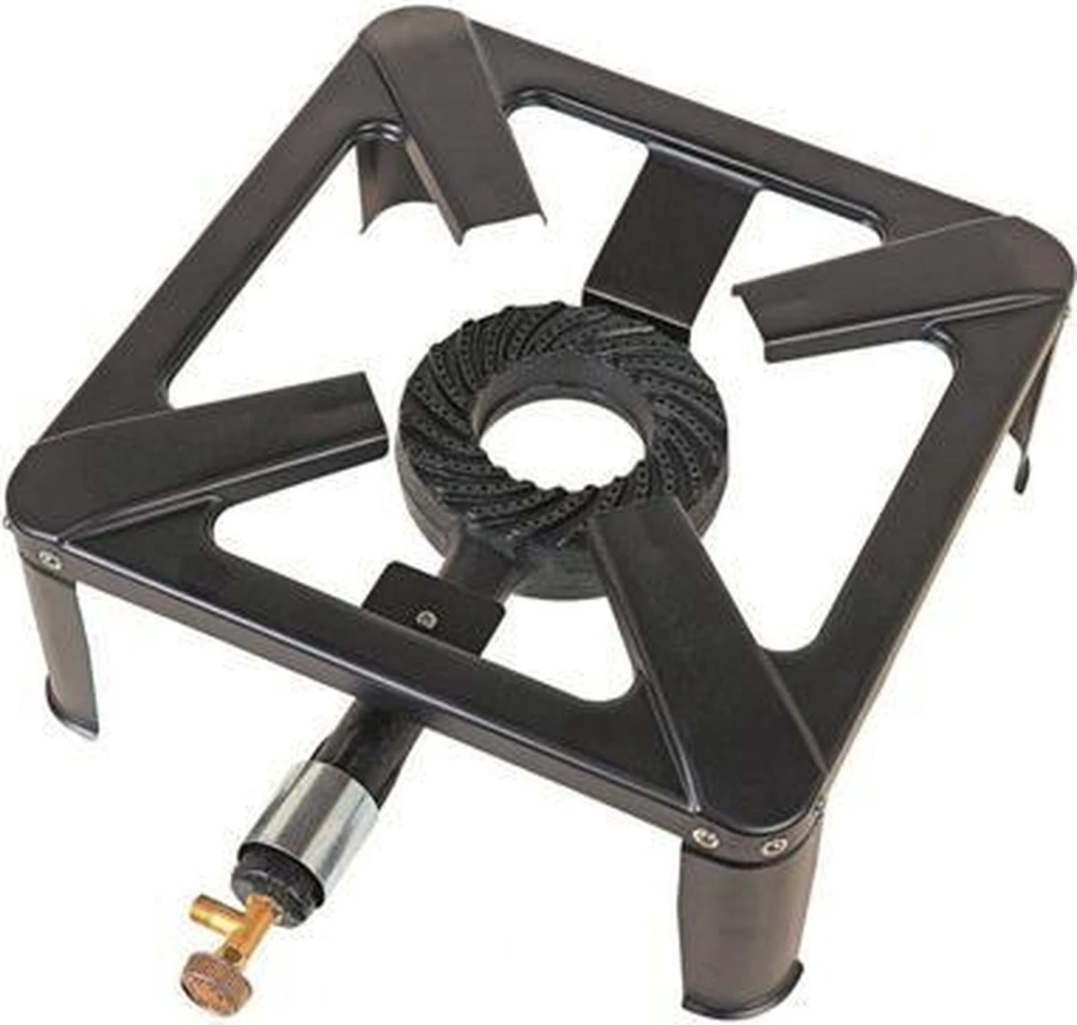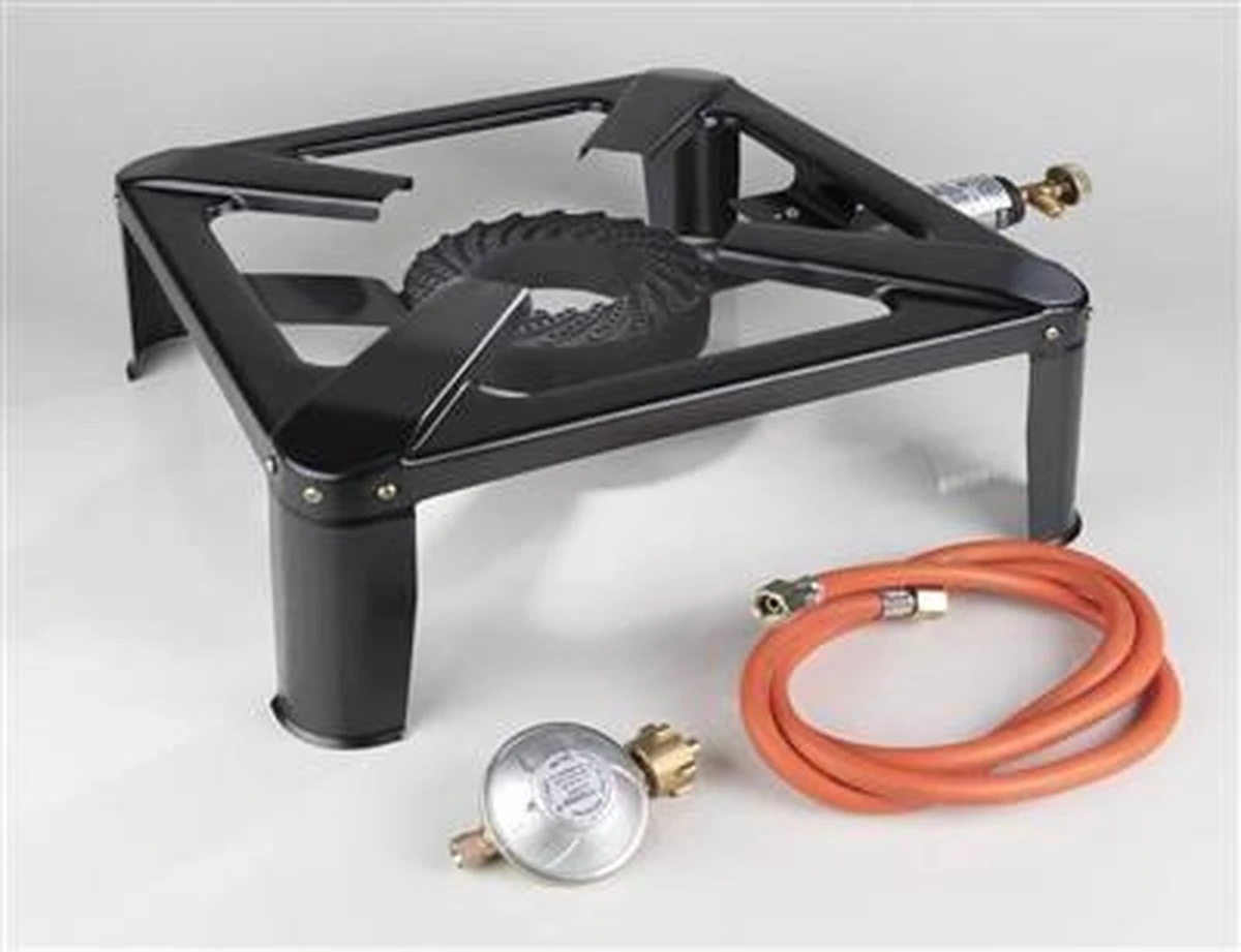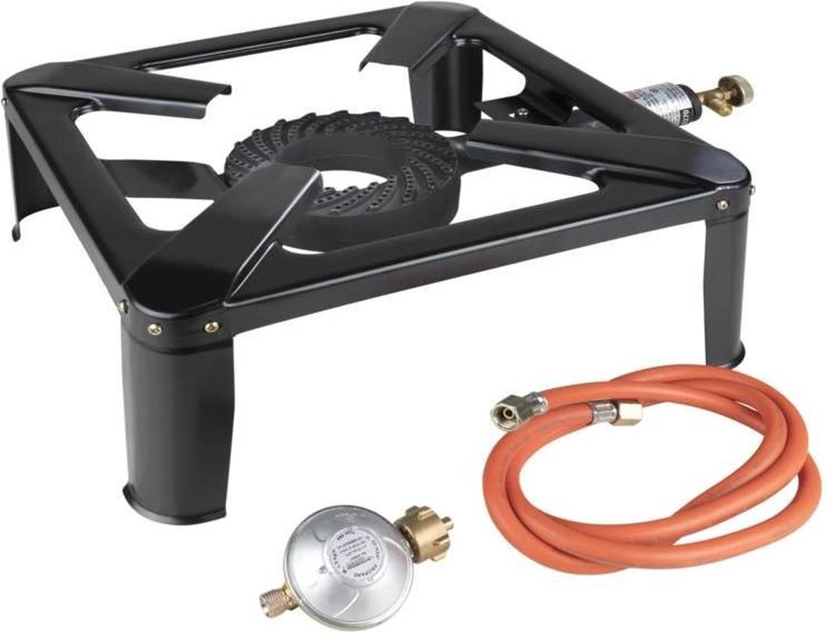 Buiten koken begint met een fijn kooktoestel. Dit kooktoestel is compact en hierdoor gemakkelijk mee te nemen. Het kooktoestel heeft 1 pit en werkt op gas en kan bijvoorbeeld gebruikt worden op campings of bij kraampjes en voor de catering. Vervaardigd uit massief gietijzer, met stabiel stalen frame. Wordt geleverd inclusief 1,5 meter gasslang met 2 x G1/4 L aansluiting en een constante 50 mbar propaan drukregelaar. Geschikt voor pannen: 25 – 45 cm