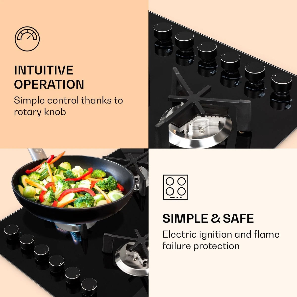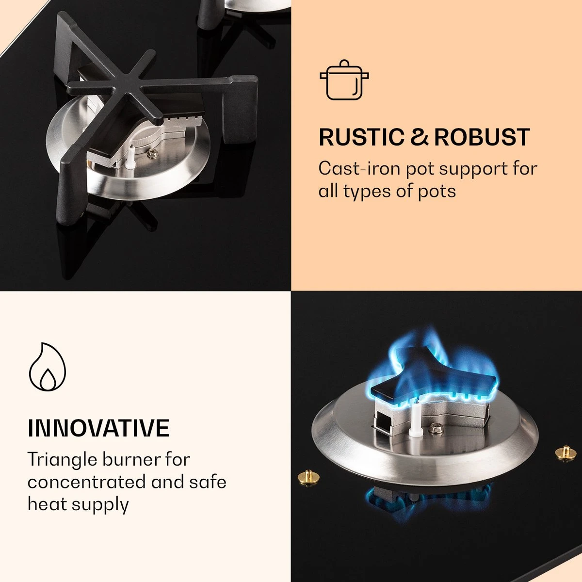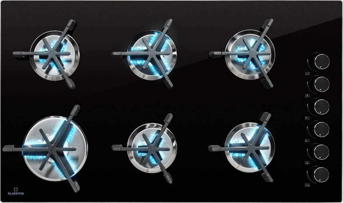 De Klarstein Trifecta 6 gaskookplaat bekoort in de eerste plaats door zijn driehoekige branders met bijzonder robuuste pannendragers van gietijzer. Door het driearmige ontwerp sturen deze warmte door sterk geconcentreerde vuurbronnen die bij het koken overtuigen door hun effiociëntie en snelheid. De exclusieve gaskookplaten zijn ingebouwd in een glaskeramisch veld met een dikte van 6 mm, waaronder de robuuste roestvrijstalen behuizing zicht bevindt. Met een vermogen van 3,2 kW verwarmt de grote brander de pannen op de gietijzeren pannendrager, terwijl 2 normale branders met elk een vermogen van 2,1 kW en de 3 extra branders met elk 1,15 kW het volle vermogen realiseren. Om de Trifecta 6 aan te steken is geen extra aansteker nodig, omdat het gasfornuis is voorzien van een elektrische ontsteking. De warmtetoevoer is heel eenvoudig te regelen via de draaiknop. 6-voudige efficiëntie, snelheid en energiebesparing: das Klarstein Trifecta 6 gaskookplaat met driehoekige branders.
